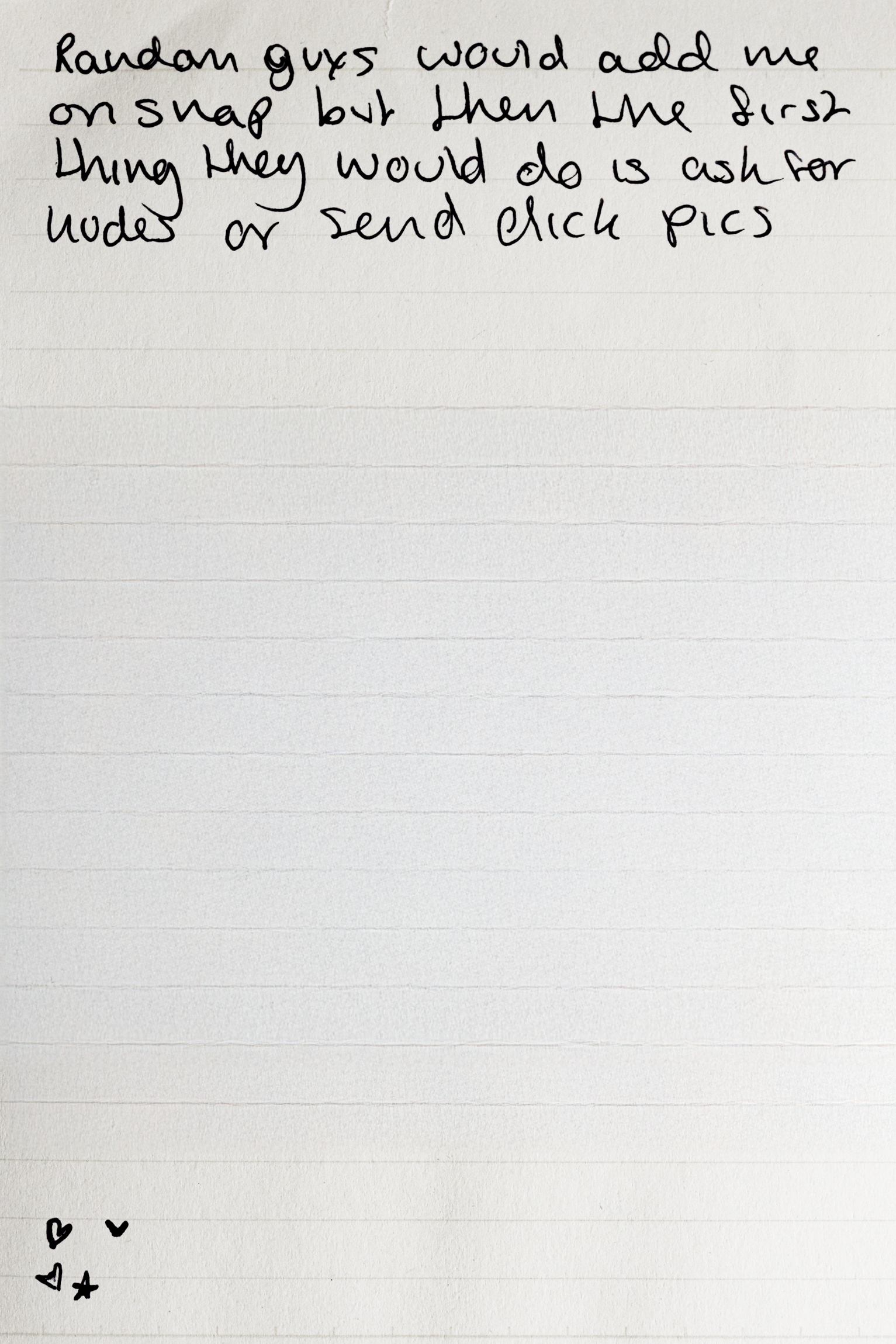 This project is a portrait of my teenage daughter and her friends growing up in a Western society still shaped by misogyny, both online and off. The photographs capture their intimate friendships, interrupted by handwritten statements about sexual harassment.